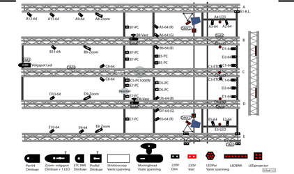 Vroeger was bij het ontwerp van een lichtplan een enorme hoeveelheid vermogen nodig, de kilowatts aan lampen vlogen je om de oren. Harting multikabels met polsdikte afmetingen en gigantische dimmerracks. Met de komst van LED techniek en slimme verbindingen is dit grotendeels verleden tijd. Toch moeten er tekeningen komen van schema’s; UTP, VIDEO, AUDIO, BEELD, DANTE, DALI, LICHT en VOEDING. Hier hebben wij veel zicht op en ervaring mee en zijn op de hoogte van de nieuwste oplossingen en technieken die soms beter of minder betrouwbaar werken dan gedacht. Tevens moeten belasting en veiligheid in ogenschouw gehouden worden.